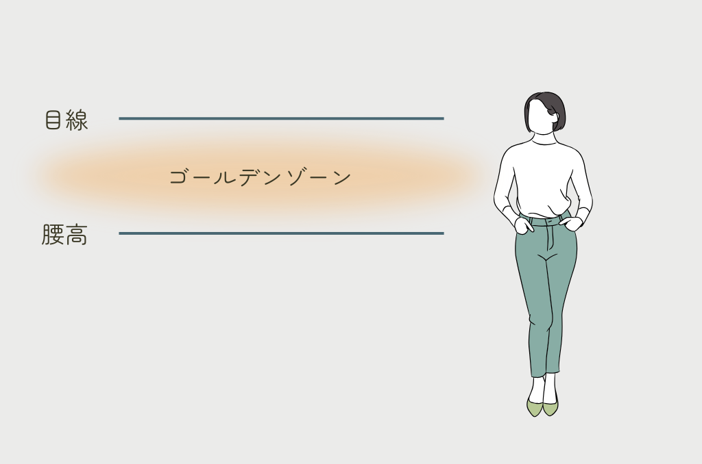すっと手が届く場所なので、ものの出し入れが一番しやすいエリアになります。