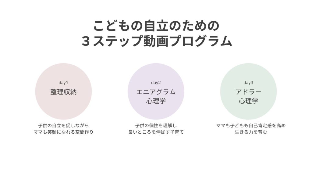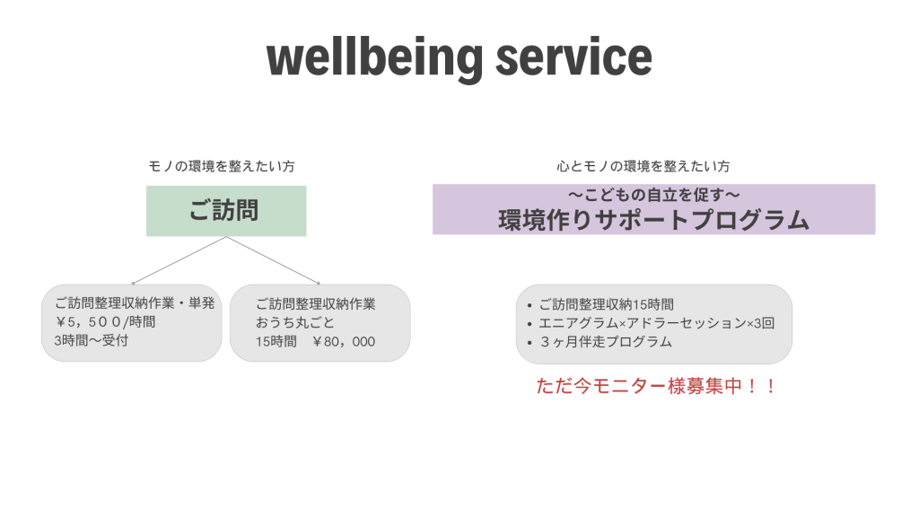 ご訪問サービスに加えエニアグラムやアドラー心理学を交えたセッションを行うことで、モノに加え心も整え、自信を持って子育てをすることができるようになります